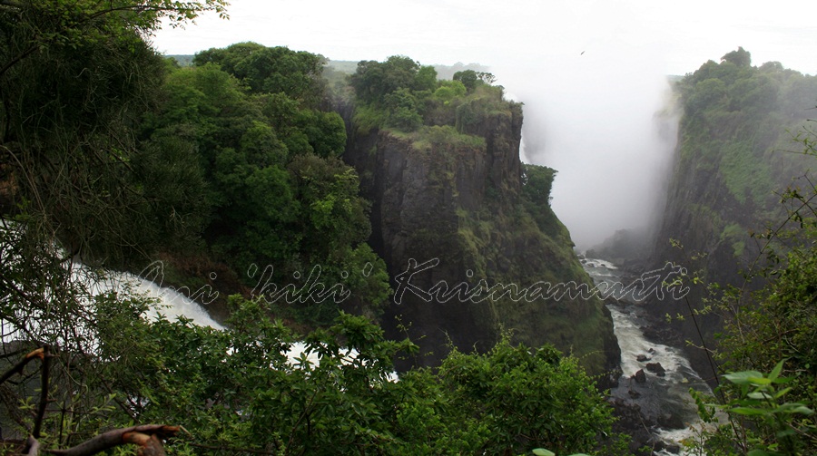 The riverine ‘rainforest’ within the waterfall splash zone is a fragile ecosystem of discontinuous forest on sandy alluvium, dependent upon maintenance of abundant water and high humidity resulting from the spray plume of about 500 m (at maximum height) that can be seen from a distance of 50 km and 30 km from Bulawayo and Lusaka roads respectively. A direct frontage viewing of the falls is possible from both Zambia and Zimbabwe