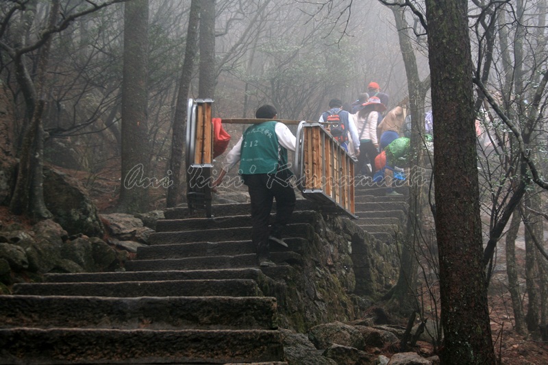 The hotels, restaurants, and other facilities at the top of the mountain are serviced and kept stocked by porters who carry resources up the mountain on foot, hanging their cargo from long poles balanced over their shoulders or backs.