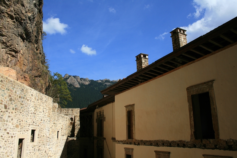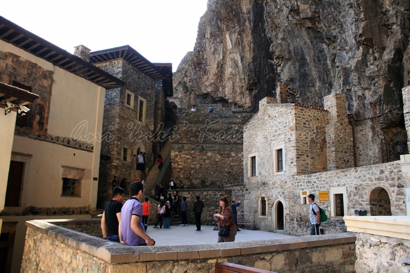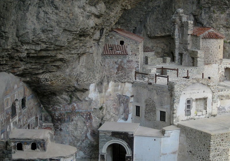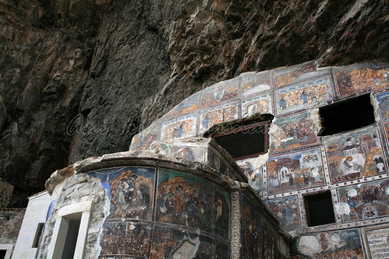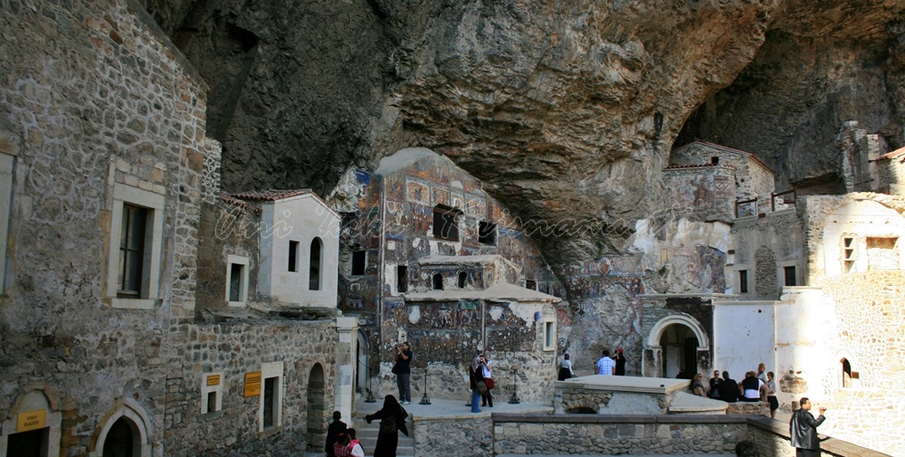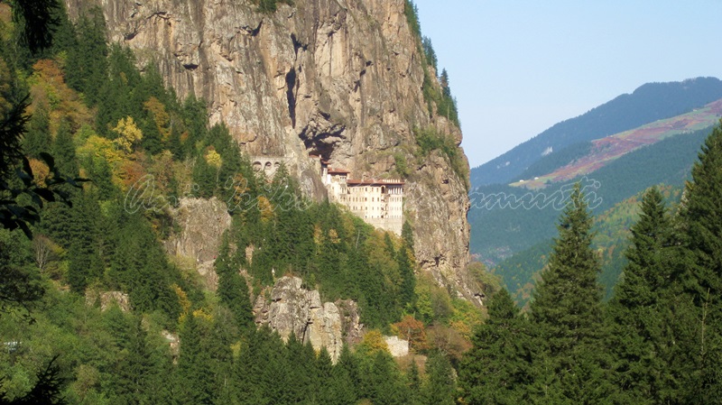 The Sumela Monastery is a Greek Orthodox monastery dedicated to the Virgin Mary (Panagia, meaning “All Holy” in Greek) at Melá Mountain (Turkish: Karadağ, which is a direct translation of the Greek name Ssou Melá, “Black Mountain”) within the Pontic Mountains(Turkish: Kuzey Anadolu Dağları) range, in the Maçka district of Trabzon Province