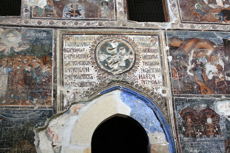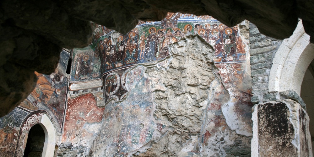 The inner and outer walls of the Rock Church and the walls of the adjacent chapel are decorated with frescoes. Frescoes dating from the era of Alexios III of Trebizond line the inner wall of the Rock Church facing the courtyard.The frescoes of the chapel which were painted on three levels in three different periods are dated to the beginning of the 18th century. The frescoes of the bottom band are of superior quality