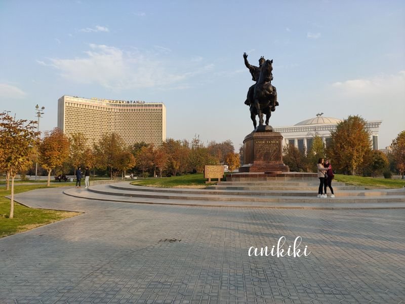 Dari jauh tampak Amir Timur Square dengan Patung Amir Timur dan Hotel Uzbekistan di background