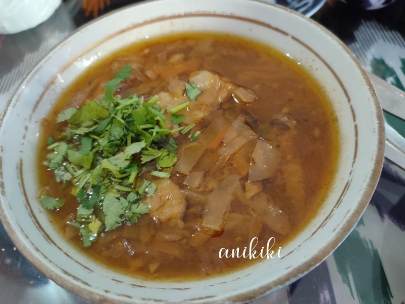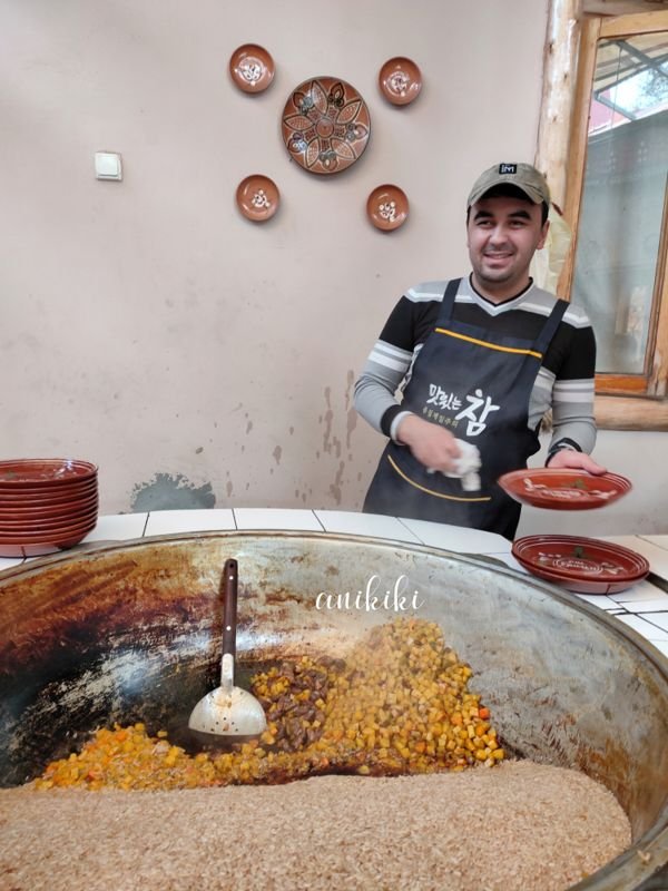Inilah bagian yang paling menarik. Sebagai seorang muslim, saya menikmati dengan tenang makanan lokal di negara mayoritas muslim karena lebih percaya akan kehalalannya.Makanan berbahan dasar utama daging menjadi ciri di sini. Mulai dari plov, manti, sashlik hingga soup semuanya daging, baik beef maupun daging kambing.