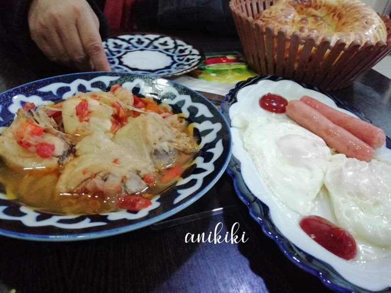 Dan di Samarkand ketika makan malam restoran banyak yang tutup, akhirnya dengan putus asa kami hanya makan sosis dan telor. Ohya, ada juga ayam yang dimasak mirip rica rica