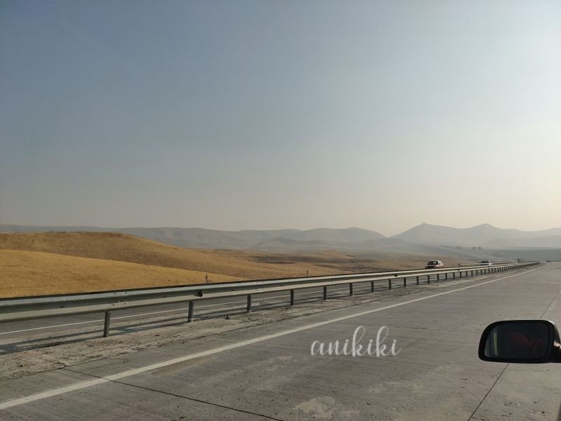 Perjalanan sejauh 112 km selama 1.5 jam melewati jalan raya yang lebar, mulus dengan pemandangan stepa kering di kiri kanan mengingatkan pada Tibet.