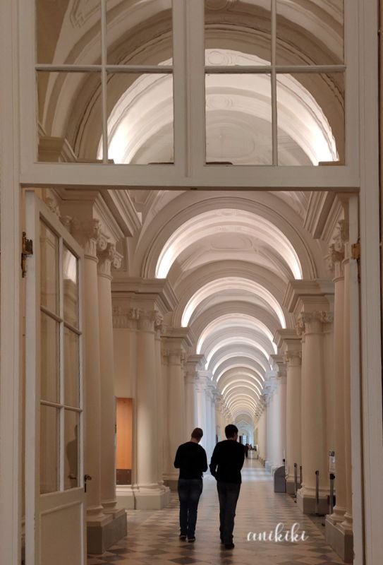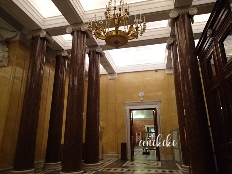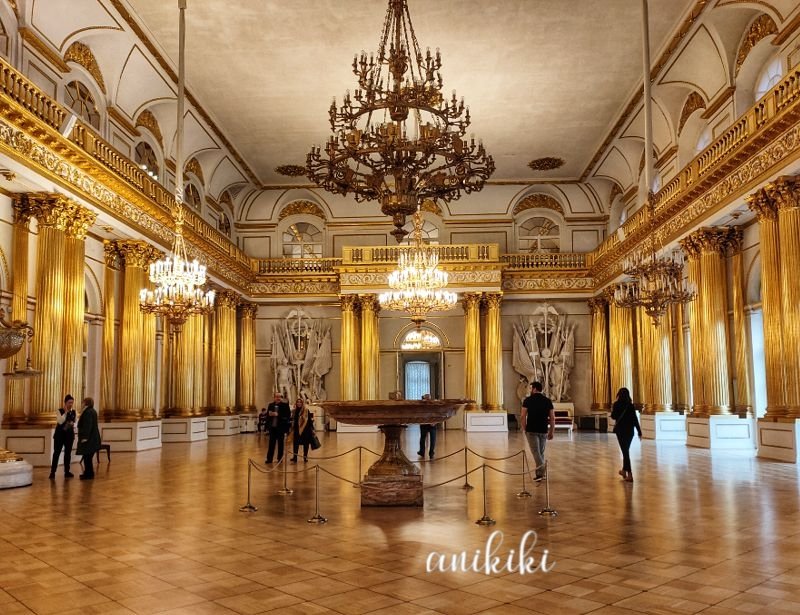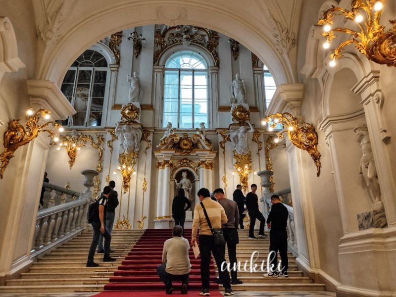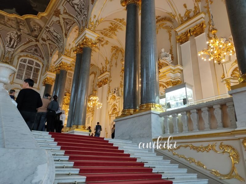 Kita harus menitipkan jaket dan tas besar di cloakroom. Kemudian mulai menaiki grand Jordan staircase