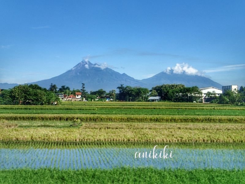 Pemandangan cantik dari kereta Jogja-Solo tampak gunung Merapi Merbabu