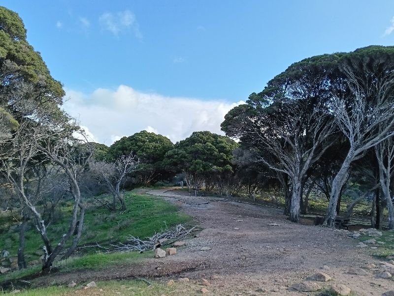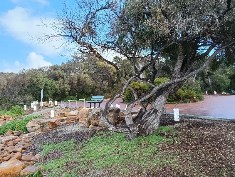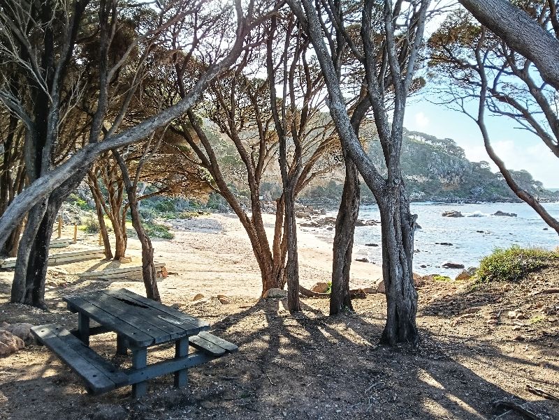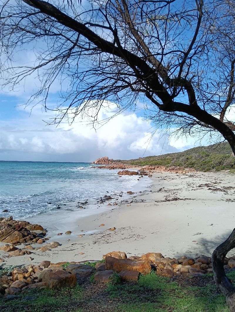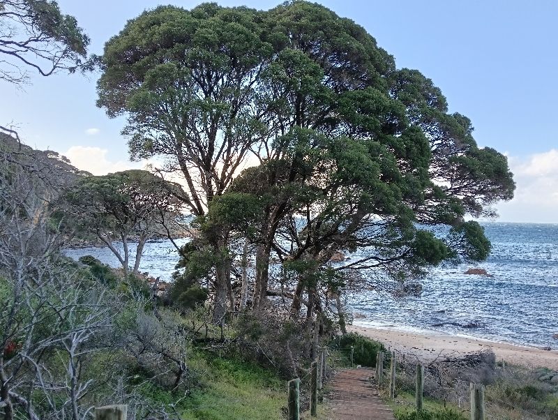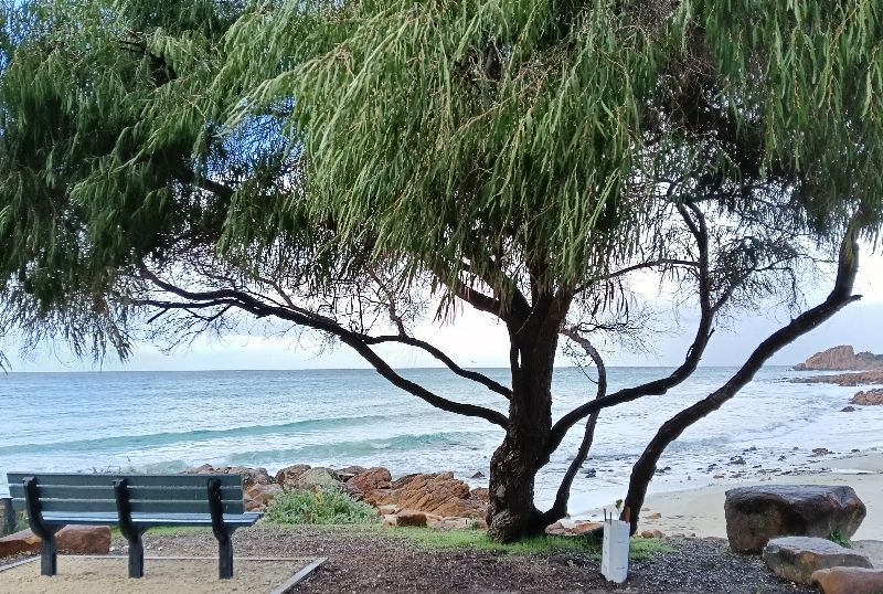 Bunker Bay in Western Australia is famous for its stunning contrast of clear turquoise water, white sand, and the unique, windswept coastal trees (often Peppi trees or other hardy natives) growing right to the water’s edge and framing the rocky coastline, creating iconic photo opportunities and sheltered spots for picnicking, with the backdrop of Cape Naturaliste’s forested terrain.